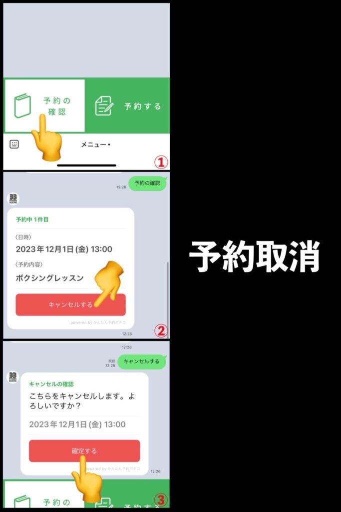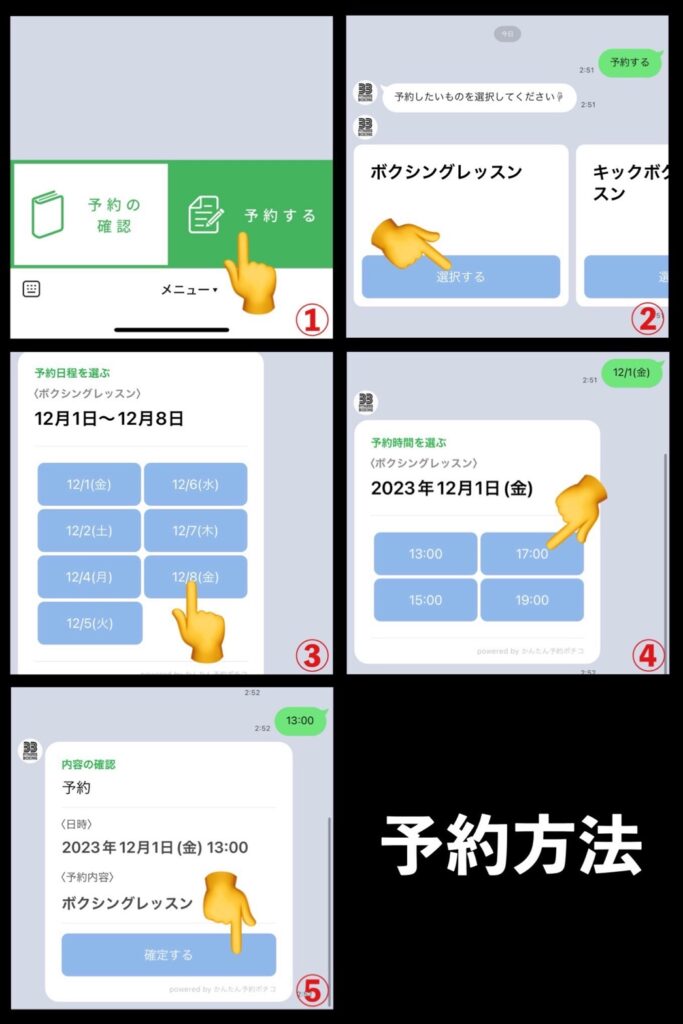 友達追加後、トーク画面にて下記の手順に従いご予約お願いします。